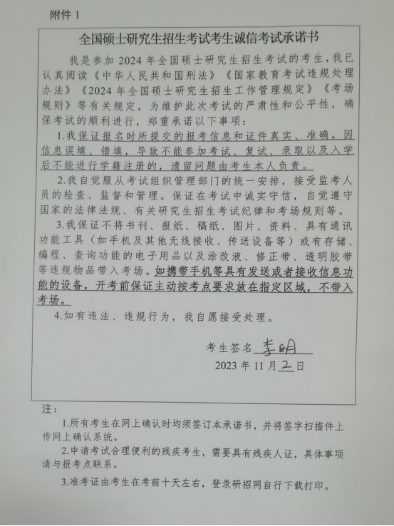 所有考生需提供具有本人手写签名的《诚信考试承诺书》(见附件1)照片,保证内容清晰完整。