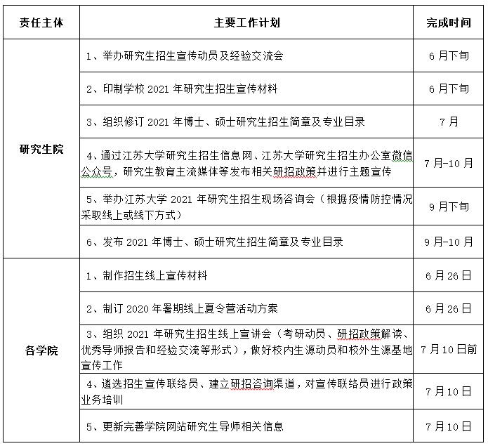 为一进步拓宽生源渠道,改善生源结构,提高生源质量,吸引更多优秀生源报考我校研究生,根据《江苏大学研究生招生宣传实施办法》(江大研字(2014)15号),结合当前疫情防控实际,现将2021年研究生招生宣传工作有关事项通知如下: