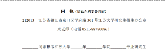 ②调档函下方“回执联”应填写拟录取考生个人姓名及拟录取学院信息并粘贴于个人档案背面,以便调入后准确接收。可从江苏大学研究生招生信息网首页-资料下载-硕士下载版块处下载《江苏大学调档函》。