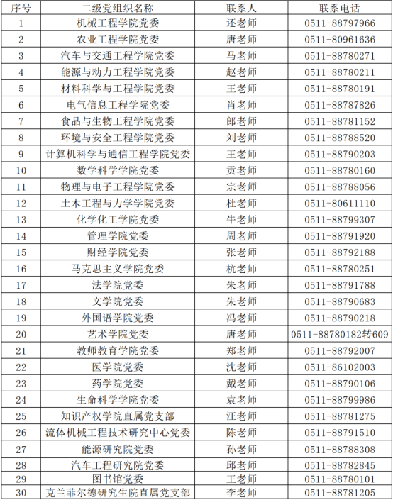 ③从江苏省外转入的党员:可以线上转入的参考②;线上不能转入的党员需持纸质党员组织关系介绍信和党员登记表在新生报到后至录取学院党组织办理转入手续。介绍信抬头填写:中共江苏大学**学院委员会(录取学院是党委的)或中共江苏大学委员会(录取学院是直属党支部的)。转入目标党组织由本人咨询录取学院党委要转入的具体党支部名称。联系方式详见下表: